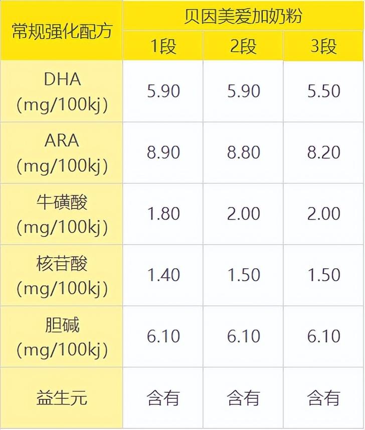常规强化配方指的是DHA、ARA、胆碱、牛磺酸、益生元、核苷酸这6个大部分奶粉都会添加的强化配方。在这方面,贝因美爱加奶粉1-3段都是添加齐全的。而且值得一提的是,贝因美爱加奶粉的DHA添加量还比较高,即使是多数奶粉都会减少DHA含量的3段,贝因美爱加也保持着5.5mg/100kj的添加量。
