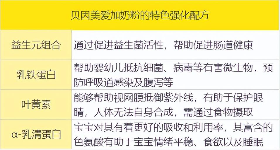 特色强化配方指的是商家们为了丰富奶粉营养,并以此作为卖点,提高市场竞争力而添加的营养配方。在这方面,贝因美爱加奶粉共添加了益生元组合、乳铁蛋白、叶黄素、α-乳清蛋白这4种营养配方,侧重于帮助孩子消化吸收、肠道健康、抵御细菌病毒、视力发育。
